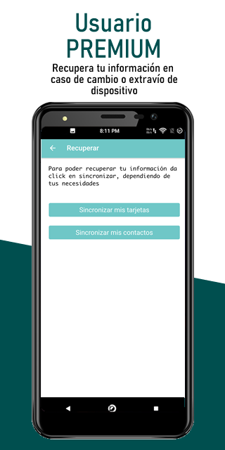 В ПРЕЗЕНТАЦИИ, помимо создания карточек, которые вы можете сканировать, это добавляет карточку провайдера в ваш каталог, как только в этом разделе вы можете синхронизировать ее, если он обновил свои данные, у вас есть его информация на кончиках ваших пальцев и доступ к его информации одним щелчком мыши, то есть, если вы хотите позвонить ему, достаточно одного щелчка мышью по его номеру телефона.