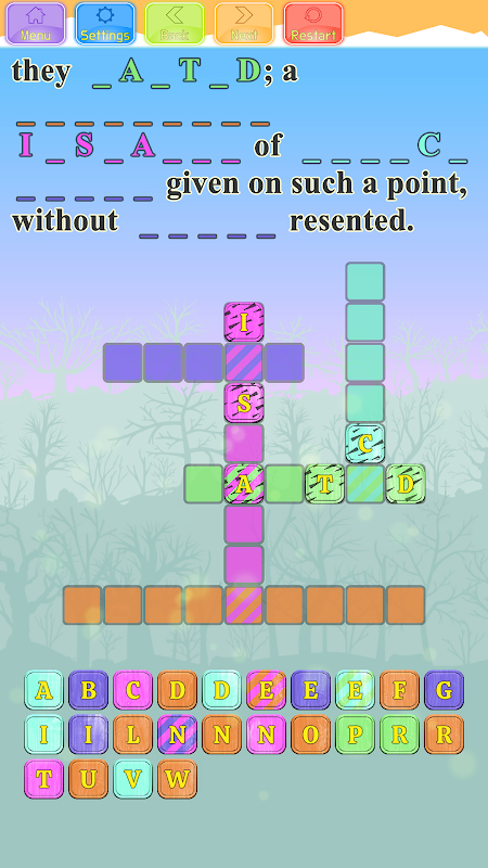 На каждом уровне вам будет представлен раздел из истории с несколькими пропущенными словами, который вы можете заполнить, решив кроссворд под текстом. Каждая введенная вами буква будет отображаться в самом тексте. Мы сделали игру очень простой в управлении, для этого требуется всего одно касание каждой буквы под кроссвордом. Все слова окрашены в уникальный цвет, буквы вне кроссворда тоже окрашены, игроку нужно заполнить буквы в слова, касаясь их в правильном порядке в словах. Каждая буква, к которой прикасается игрок, переходит прямо на первое доступное место в слове того же цвета. Если буква окажется не в том месте, она будет отмечена желтой точкой, которая будет мигать. Игрок может легко исправить размещение буквы в неправильном месте, прикоснувшись к ней, она выскочит наружу, а затем игрок должен коснуться правильной буквы, принадлежащей следующему свободному месту в словах. Буквы, принадлежащие двум словам, отмечены диагональными линиями с цветами обоих слов. Когда пользователь прикасается к такой букве, она перескакивает прямо на свое место.