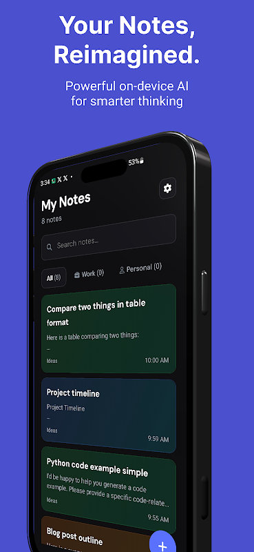 В отличие от традиционных инструментов ИИ, ваши заметки, записи и чаты никогда не покидают ваш телефон. - Общение с вашими заметками: Задавайте вопросы о ваших заметках, суммируйте ключевые моменты или генерируйте новые идеи через приватный, безопасный чат с использованием ИИ.