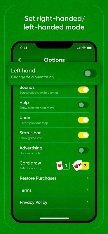 Игровое приложение имеет интуитивно понятное и простое управление, перемещение карт одним нажатием, легкое перетаскивание стопок. В настройках можно выбрать игру правой или левой рукой. Настройте легкий режим с одной раздачей карт или более сложный с тремя раздачами карт. Вы можете поставить игру на паузу, не теряя текущий прогресс, и возобновить ее позже, если вам нужно будет что-то сделать.