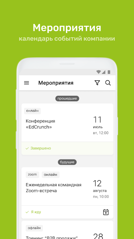 ⁃ Календарь корпоративных мероприятий с возможностью подать заявку на участие