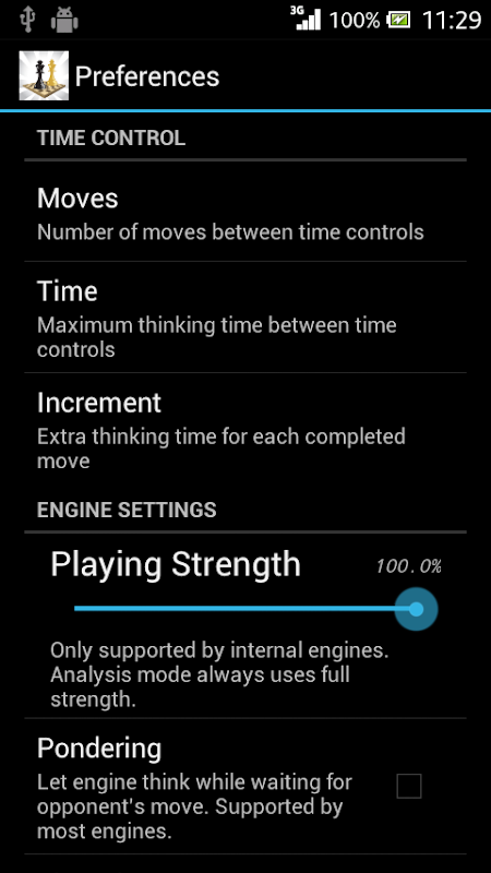* enable/disable "permanent brain". With this feature activated the computer will think up moves even when it's not its turn to move. Enable this feature for maximum playing strength.