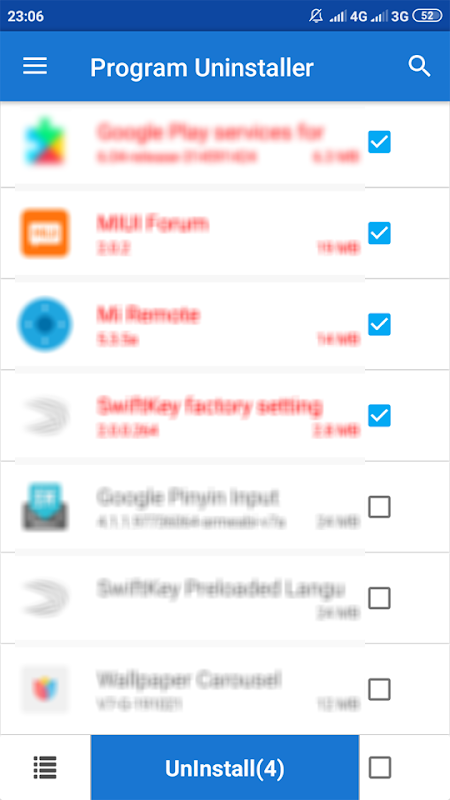 Program Uninstaller is a tool to uninstall apps from android phones. easy to use, you can select multiple apps you want to uninstall, and click "Uninstall" button to remove them.