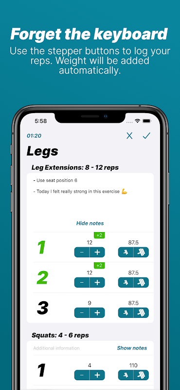 Используя кнопки степпера, вам нужно нажать всего один раз, чтобы зарегистрировать новый вес или количество повторений. Кнопка степпера для веса использует приращение, установленное в настройках тренировки, для увеличения или уменьшения веса. В лучшем случае вам следует использовать кнопки степпера только для выполнения повторений, поскольку Progression автоматически справляется с увеличением веса.