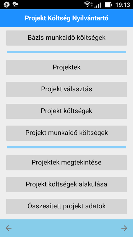 Megtekinthetők a tárolt projekt adatok, a költségek alakulása, összesített projekt adatok.