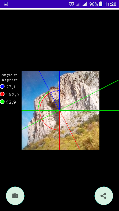 Приложение позволяет измерять углы наклона удаленных объектов через камеру или использовать прибор как уровень, прикладывая прибор к целевому объекту с неизвестным углом наклона.