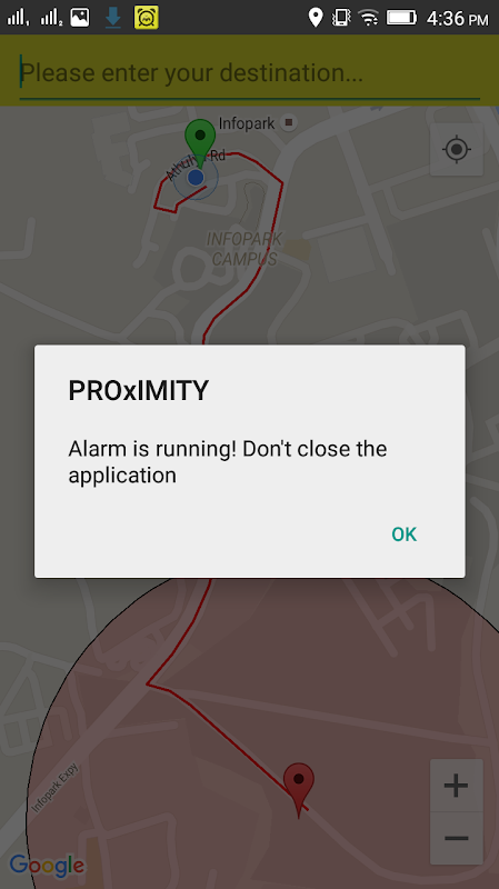 Proximity - A user-friendly mobile app for travellers who never want to miss their destinations. This is a location based android application that allows the user to set alarm to receive an alert when they reach their destination. The app offers two types of alert - Alarm with travel time and Alarm with distance.