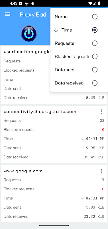 - Статистика: домены, запросы, заблокированные домены, заблокированные запросы, отправленные данные, полученные данные...
