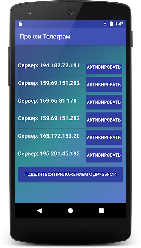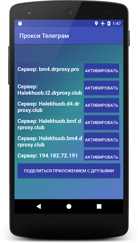 Приложение, при помощи которого можно выбрать и установить прокси для разблокировки телеграм. Выберите прокси-сервер из списка и нажмите кнопку "Активировать".