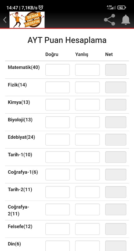 С системой расчета баллов TYT нашего приложения вы можете рассчитать наиболее точный балл TYT. Кроме того, вы можете узнать свой балл за размещение и исходный балл, введя свой дипломный балл в соответствующем месте при расчете.