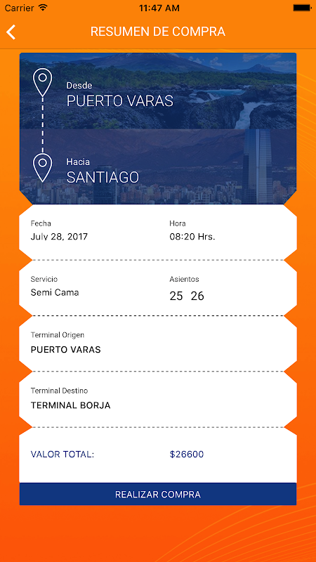 Aplicación móvil de compra de pasajes en bus, para destinos en el norte y sur del Chile (excluye a la quinta región) en esta aplicación cuentas con el registro de tus compras, viajes realizados, promociones y mucho más. ¡Realiza la compra de tus pasajes más rápida, eficiente y directa!!!