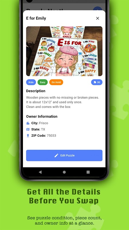 Просматривайте растущую коллекцию головоломок, которыми поделились другие любители головоломок, просматривайте подробные списки с примечаниями к условиям и запрашивайте обмен всего за несколько нажатий. Отслеживайте все свои запросы в одном месте и легко подтверждайте соглашения с помощью понятных пошаговых инструкций.