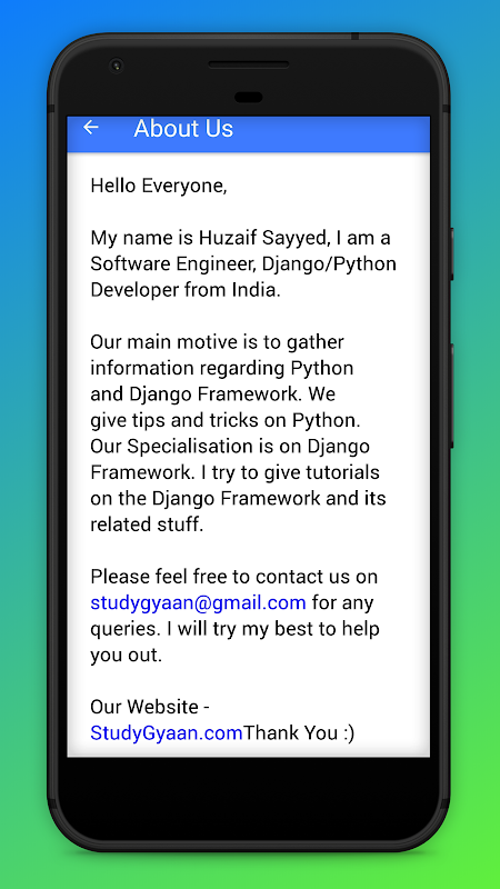 This Application will help you to teach python in most simple, easy and effective way. Once you complete all the lesson in Python Programming Tutorial Application, you have to give a Python Programming Exam and if you pass that exam you will receive a FREE Python Certification from StudyGyaan on provided email address. This is the best application to learn Python Programming with examples from experts.