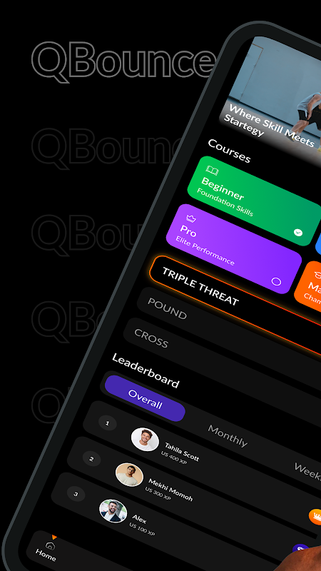 Тренировочное приложение QBounce с пошаговыми инструкциями, домашними тренировками и обратной связью от ИИ.