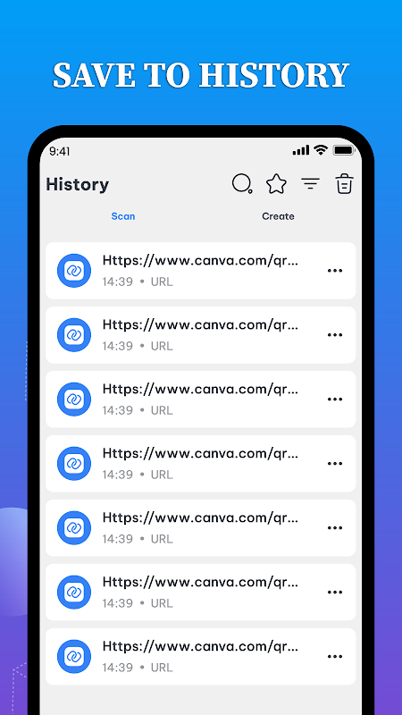 - Сканер QR-кода и сканер штрих-кода сохраняет историю всех ваших отсканированных и сгенерированных кодов, что позволяет легко отслеживать все отсканированные вами коды.