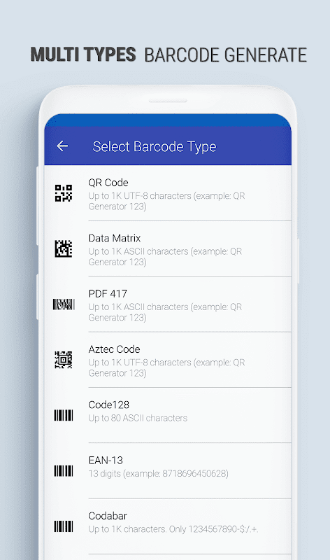 QR Scan также помогает вам создавать QR-код, код матрицы данных, код PDF 417, код Aztec из контактной информации, электронную почту, SMS-сообщение, номер телефона, конфигурацию wifi, местоположение, событие календаря, URL-адрес веб-сайта или обычный текст и т. Д. Он также генерирует другие типы штрих-кодов, такие как Code 128, EAN 13 (код продукта), Codabar, UPC A, код ITF. Ваш QR-код / штрих-коды могут настраивать размер и цвет изображения штрих-кода, а затем сохранять на хранение или делиться ими со своими друзьями.