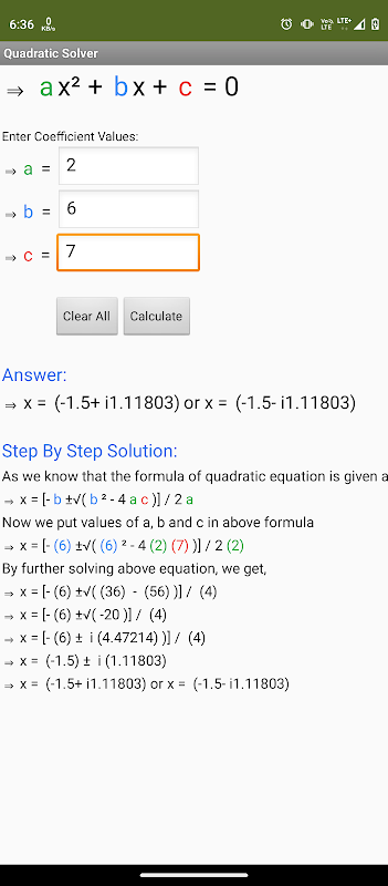 Приложение Quadratic Equation Solver позволяет пользователям вводить коэффициенты квадратного уравнения в стандартной форме и автоматически вычисляет корни уравнения. Он не только дает вам ответ, но также показывает пошаговые решения для решения уравнения. Пошаговое решение помогает пользователю понять, как был получен ответ, что делает его отличным инструментом обучения.