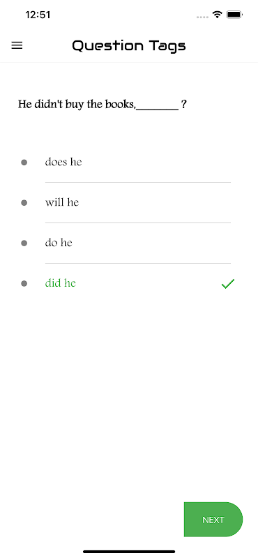 Цель этого приложения - познакомить вас с основными понятиями грамматического элемента «Тег вопроса». В приложении есть интерактивные упражнения на его основе. Это позволит вам изучить навыки, необходимые для анализа тегов вопросов. Он поможет вам писать любые вопросы на разных уровнях. Каждый тест поможет вам значительно улучшить свои знания. Здесь представлены учащиеся для всех уровней. Это означает учащихся начального, среднего и продвинутого уровней. У нас есть практические упражнения, где вы можете отвечать на вопросы по тегам и получать баллы. Есть много-много вопросов для практики. Вы также можете проанализировать результаты своих тестов и проверить, какие из них верны, а какие нет. Это приложение разработано, чтобы помочь вам справиться с тегом вопроса ..