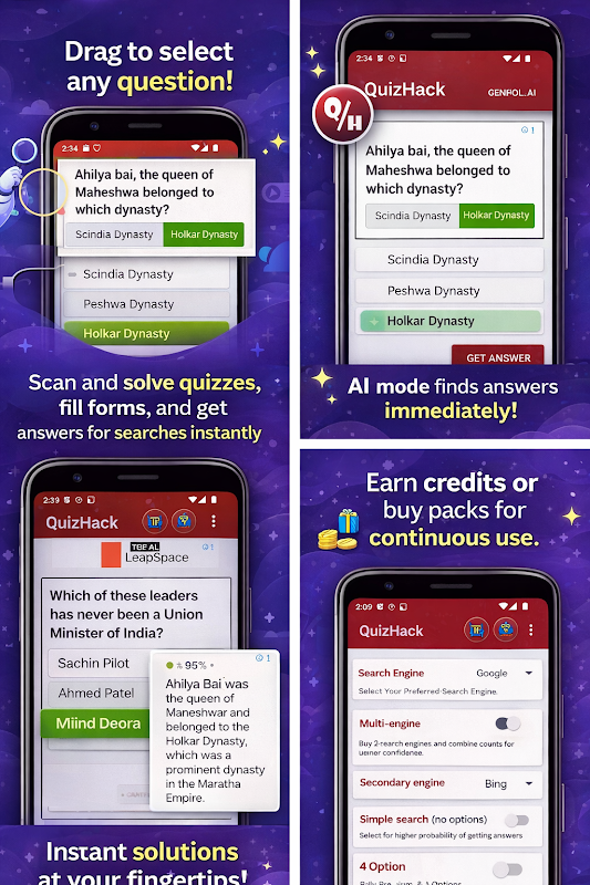 QuizHack — это вспомогательный инструмент, предназначенный для помощи пользователям в поиске и понимании информации, отображаемой на их экране. Пользователи несут ответственность за то, как они используют приложение.