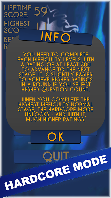 It contains hundreds and hundreds of questions in 6 difficulty levels! You can progress to higher difficulty levels my mastering the lower ones, and eventually, you will reach the Hardcore mode - if your rating is high enough!