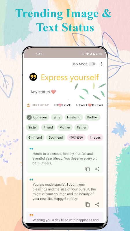 Это приложение предлагает вам коллекцию статусов на хинди и английском языках. Вы получите статус в нескольких категориях, таких как - любовный статус, мотивационный, жизненный статус, вдохновляющие цитаты, забавный статус, грустный статус, любовные цитаты, статус сарказма и многое другое.