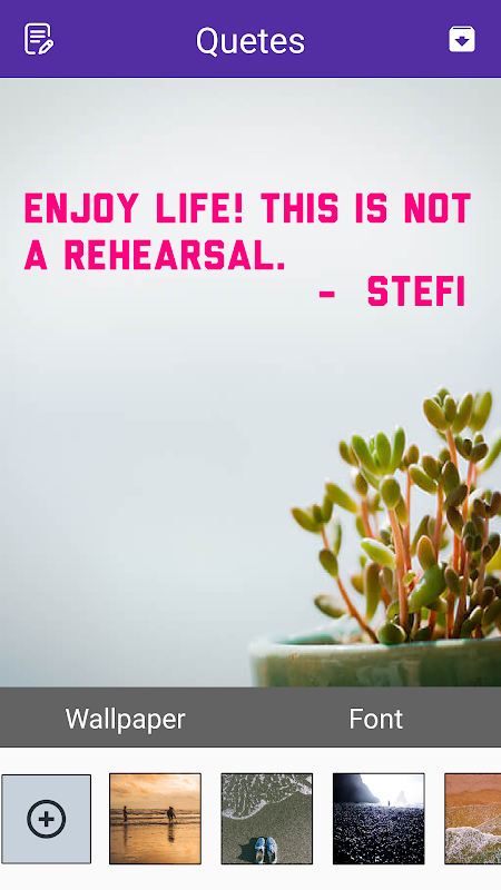 Quotes Maker is the best and easiest way to create and share your quotes with the world. Quotes Creator ready with customizing options such as background, text colors, text size, and fonts, or you can choose your photo from your Photo Gallery to be used as background, so you can share your own quotes with your friends.