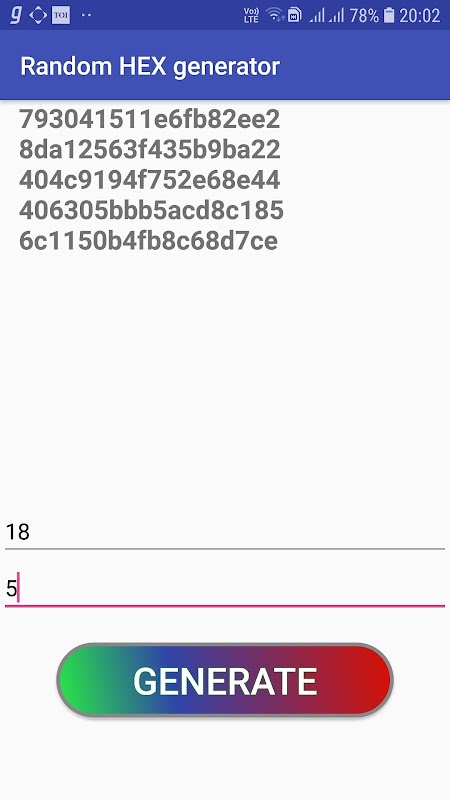 The App generates hex number of the a length requested by user and also generates multiple number of results .