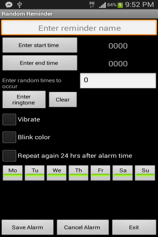 For configure, set Start Time, End Time, Number of random times to occur, repeating, ringtone for the alarm.