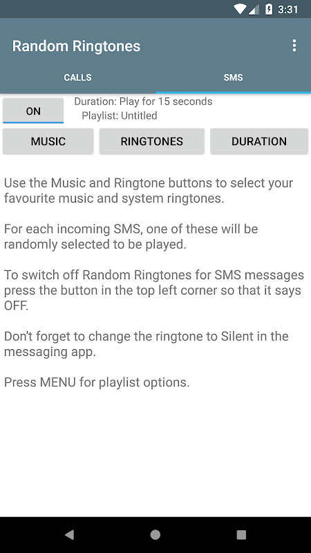 Случайно рингтоны для входящих звонков и текстовых сообщений. Сделать плейлисты и назначить их либо звонков или SMS. Когда поступает сообщение вызова или текстового случайный выбор будет сделан из установленного списка.