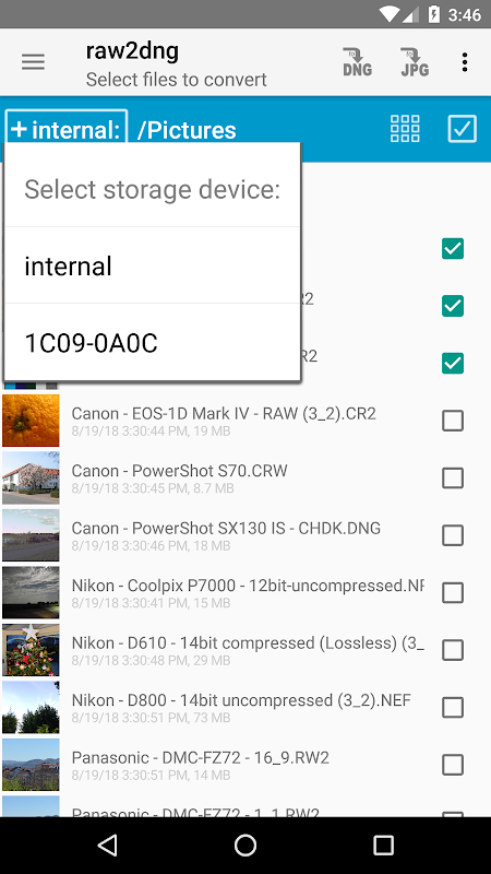 - Поддерживает преобразование DNG в DNG для сжатия DNG-изображений без потерь, сделанных камерой телефона (например, на ~ 60% на Samsung S6 & S7)