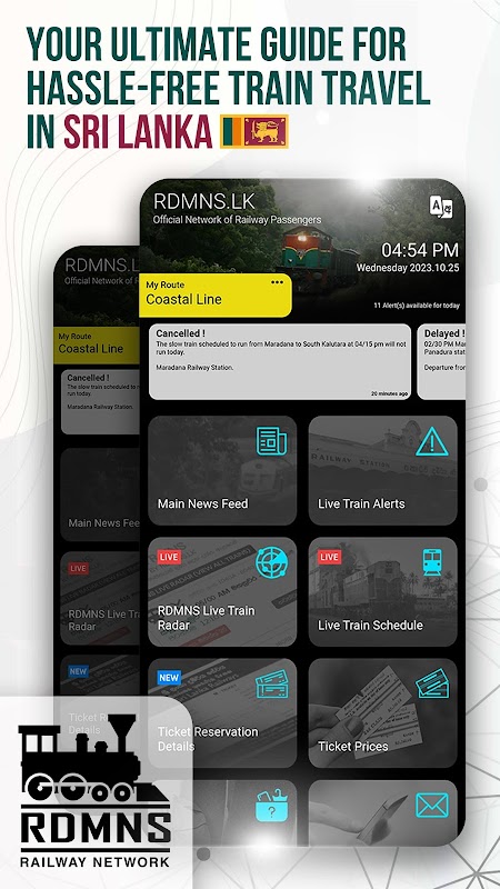 Приложение RDMNS.LK предоставляет обновления и оповещения о поездах в Шри-Ланке в режиме реального времени.