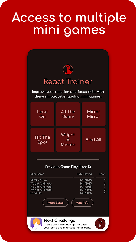 React Trainer включает набор мини-игр, цель которых — улучшить вашу реакцию и концентрацию. Игры увлекательные, но простые. Несколько минут игры каждый день могут помочь натренировать ваш разум концентрироваться в стрессовых ситуациях.