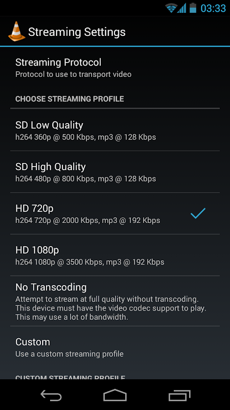 Вы можете выбрать из встроенной потоковых профилей для 360p, 480p, 720p и 1080p резолюции, и вы можете настроить свой собственный профиль, который позволяет определить видео кодек, разрешение, видео битрейт, аудио кодек, битрейт аудио и нет каналов. Вы также можете попытаться поток без перекодирования видео, если у вас есть достаточную пропускную способность. Вы можете выбрать для трансляции потока по HTTP или RTSP.