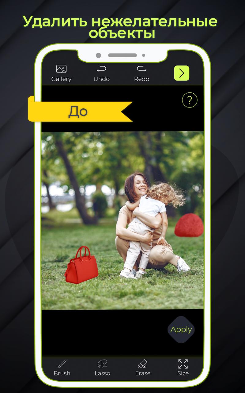 Это новое приложение для удаления объектов, которое использует расширенные методы для удаления нежелательных объектов с ваших фотографий. Удаление нежелательных объектов поможет вам избавиться от предметов, которые закрывают обзор любой части вашего изображения, и позволит вам аккуратно удалить все, что вам не нужно. Вы можете стирать объекты, человека, текст и стикеры с помощью этого волшебного ластика. Его кисть или лассо позволяют удалять нежелательные объекты кончиком пальца и не влияют на качество или количество пикселей изображения. Это удаление объекта никогда не удалит или не заменит ваши фотографии без вашего разрешения, и оно сохранит ваши старые фотографии после удаления ненужного содержимого с фотографии как новые. Вы можете повторить и отменить шаги, которые вы сделали. Загрузите Удалить нежелательный объект и наслаждайтесь лучшим приложением для удаления объектов.