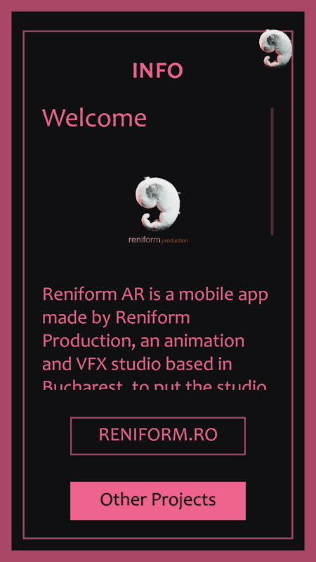 Reniform AR - мобильное приложение, созданное Reniform Production, студией анимации и VFX, расположенной в Бухаресте, для создания студийных проектов в новой среде взаимодействия с аудиторией. Возьмите напечатанные цели и погрузитесь в наш эстетический опыт AR!