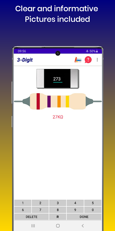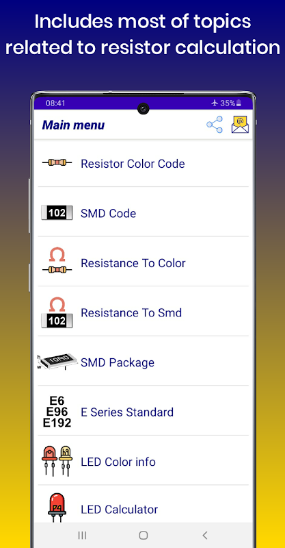 Приложение представляет собой простой в использовании калькулятор SMD-кода для расчета сопротивления резистора и SMD-пакета.