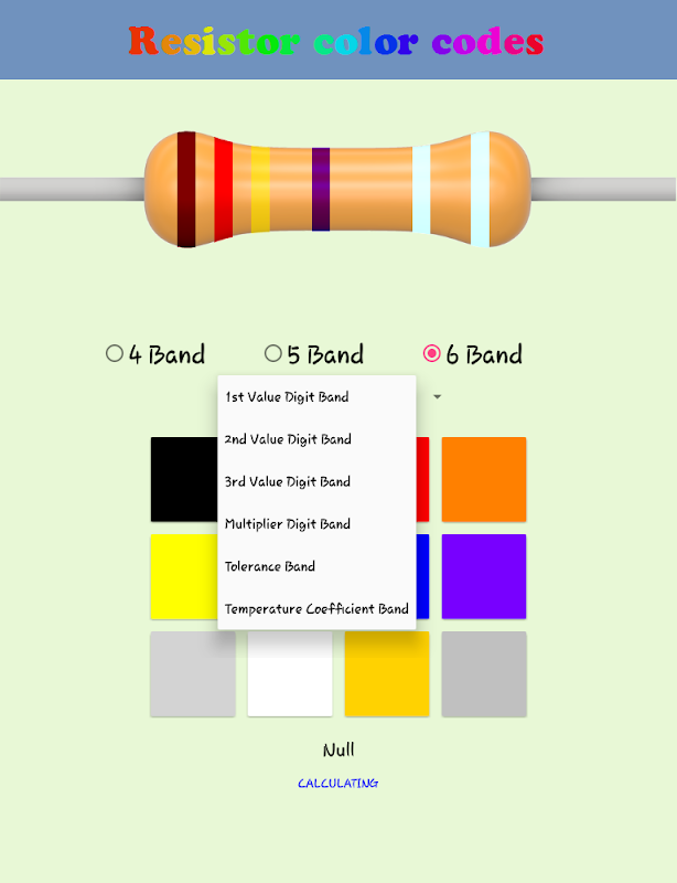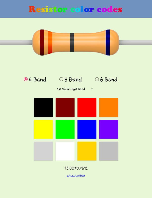Resistor Color Codes application support for full color in standard such as Black color, Brown color, Red color, Orange color, Yellow color, Green color, Blue color, Gray(Grey) color, White color, Gold color and Silver color. Therefor you just enter the color of the resistor you need to know and then you can get the Resistance, Tolerance and Temp coefficient of the resistor.