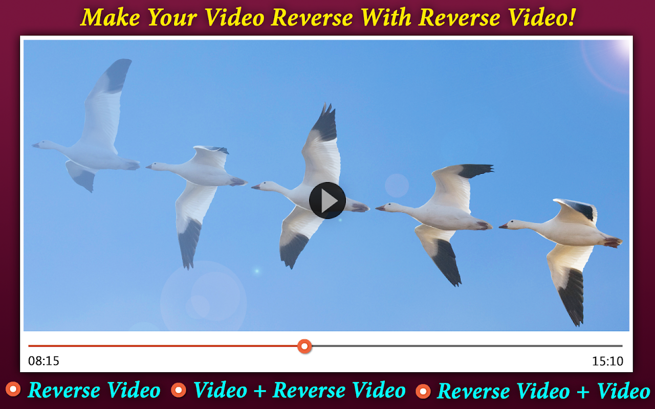 Create and Watch Videos in Reverse and create Combination of Video + Reverse Video or Reverse Video + Video to creation fun loops of Videos with Advanced Reverse Video Editor.