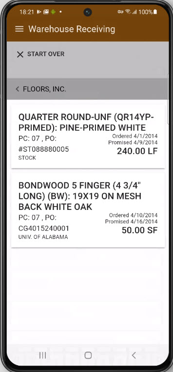 • Мобильная панель с открытыми строками заказа на закупку, которые необходимо получить