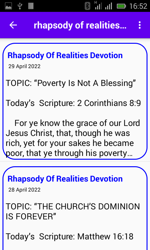 Мобильное приложение Rhapsody Of Realities Devotion - это инструмент, который обеспечивает простой способ чтения вашей ежедневной преданности на ходу, он предоставляет простой в использовании интерфейс, который организует чтения по календарным датам, что делает их