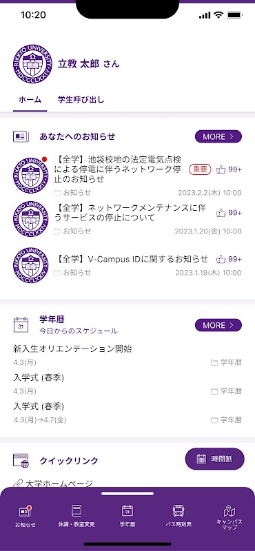 В дополнение к информации о занятиях, такой как расписание и информация об отмене занятий, мы будем предоставлять информацию, полезную для университетской жизни, такую как объявления из университета и расписание автобусов. Вы также можете автоматически получать уведомления от университета с помощью push-уведомлений.