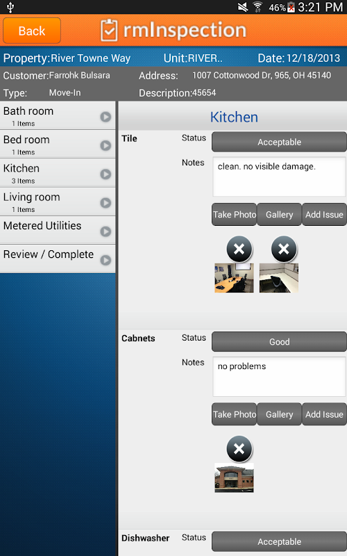 • Complete inspections in Rent Manager and account for the areas/items that must be checked during an inspection (e.g.—Kitchen: oven, refrigerator, microwave, dishwasher, cupboards, floors, etc.)