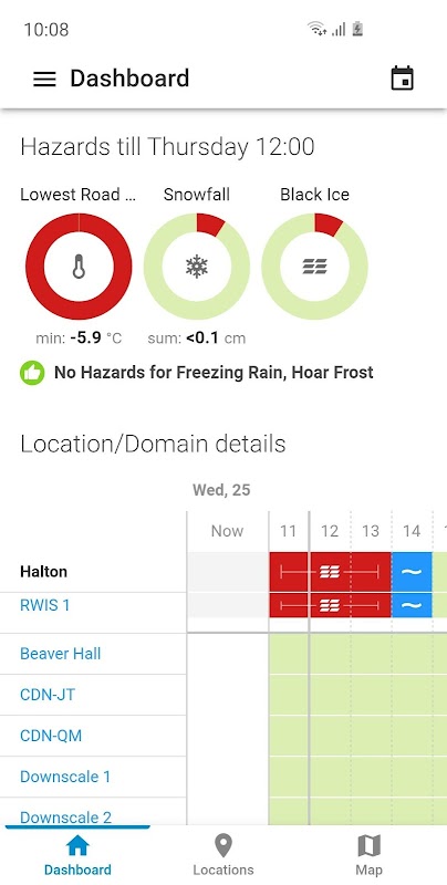 Панель управления RoadMaster предоставляет предупреждения, когда прогнозируется скользкая погода или когда прогнозируется, что количество снега или максимальные порывы ветра превысят заранее определенный порог в следующие 24 часа. На приборной панели также отображается более подробная информация, такая как минимальная температура поверхности дороги и дорожные условия для местных систем и доменов информации о погоде. Почасовые прогнозы погоды на дорогах представлены в виде простых в использовании таблиц и графиков с цветовой кодировкой.