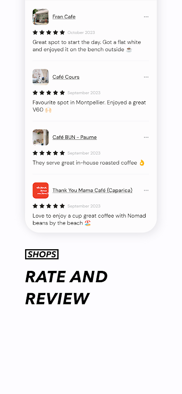 ⭐️ Рейтинги и обзоры. Воспользуйтесь мудростью кофейного сообщества и откройте для себя кофейни с самым высоким рейтингом. Читайте подлинные отзывы пользователей, делитесь своим опытом и принимайте обоснованные решения о своих кофейных приключениях.