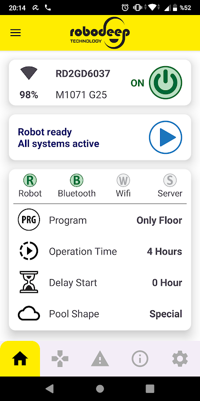С помощью Robodeep вы можете отслеживать и контролировать лучшее в отрасли оборудование для бассейнов в любое время и в любом месте. Robodeep предлагает максимальное интеллектуальное управление бассейном с мобильного устройства, предоставляя владельцам бассейнов и профессионалам незабываемые впечатления от использования бассейна на месте или в пути.