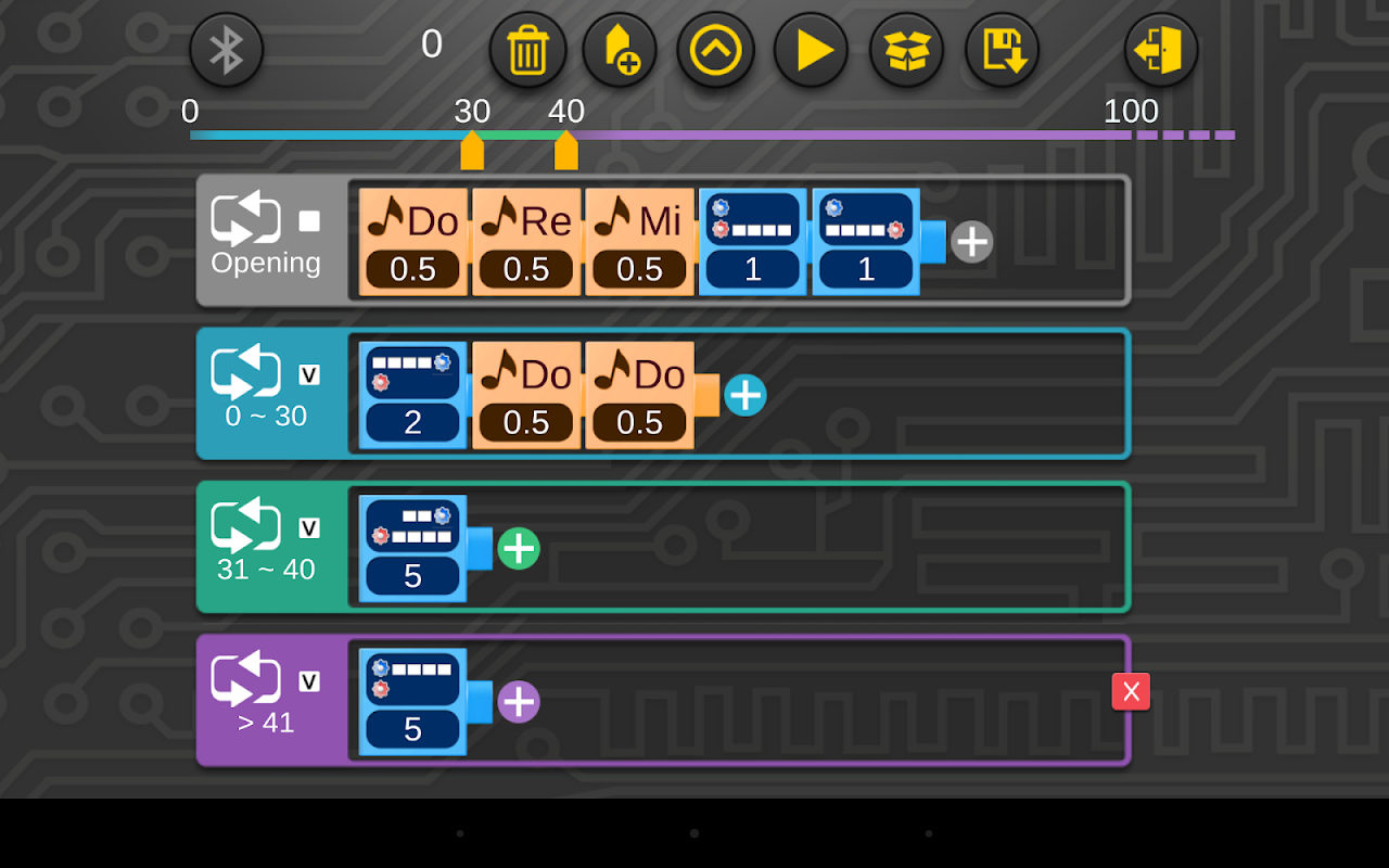 • Различные сегменты программы можно настроить на запуск при первом запуске, а затем при обнаружении ультразвуковым датчиком объектов на разных расстояниях от модели.