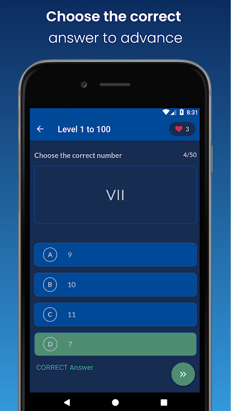Проверьте свои знания, пытаясь угадать римские цифры на каждом уровне. Выберите правильный ответ внизу, чтобы перейти на следующий уровень.