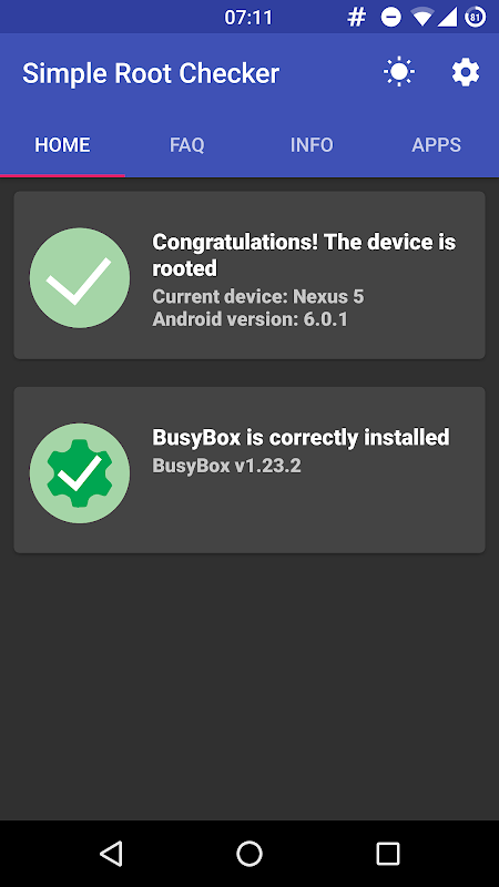 Корневая Checker это приложение, разработанное в соответствии с инструкциями Google о Material Design. Он проверяет, для надлежащего осуществления процесса укоренения и установки пакета UNIX BusyBox через простой алгоритм, который был эффективен на более чем 150 000 различных устройствах. В приложении есть также ряд ответов на часто задаваемые вопросы о моддинг на Android платформы.
