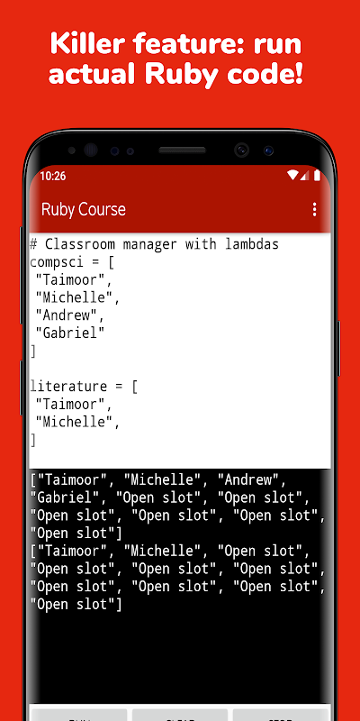Killer feature: you can run actual Ruby code within this app! No simulation, it's actually Ruby under the hood!