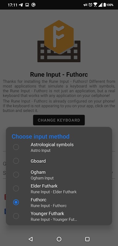 При использовании приложения Android отображает значок клавиатуры на верхней или нижней панели. Нажав на нее, вы можете выбрать, какую клавиатуру вы хотите использовать. Выберите Ввод рун - Футорк и начните писать рунами!